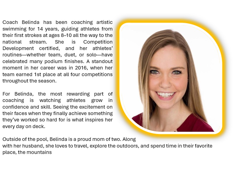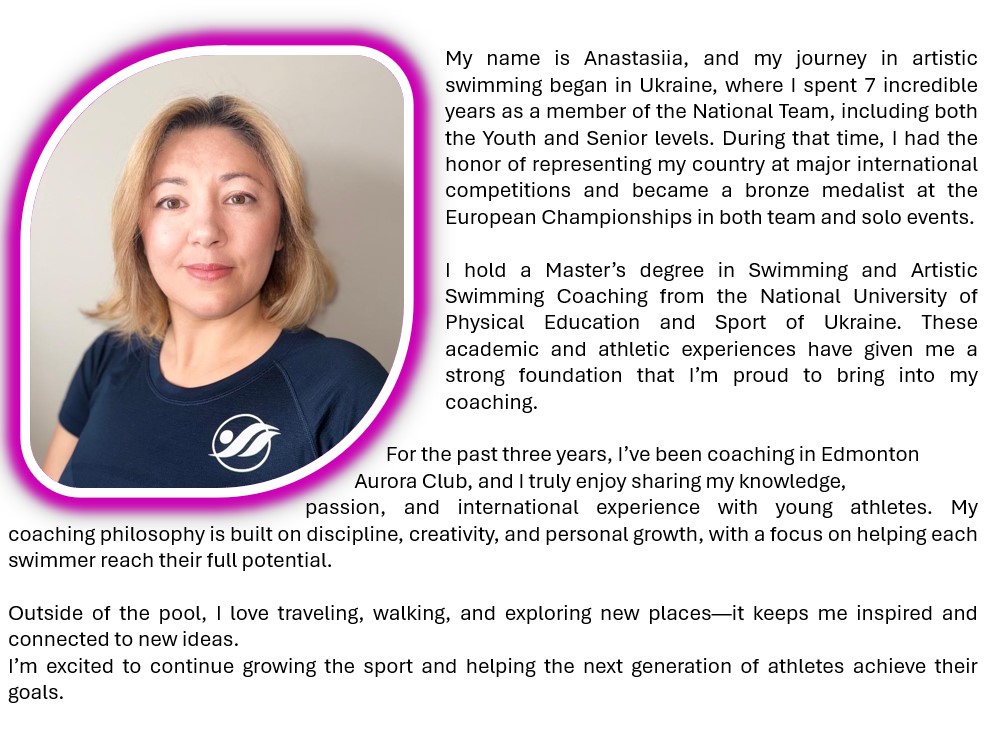 My coaching philosophy is that swimming should be challenging but also fun. I believe the best results come when athletes love the process and feel excited to come to practice. I want to inspire a love for synchronized swimming, helping swimmers appreciate both the art and athleticism, not just the competition.